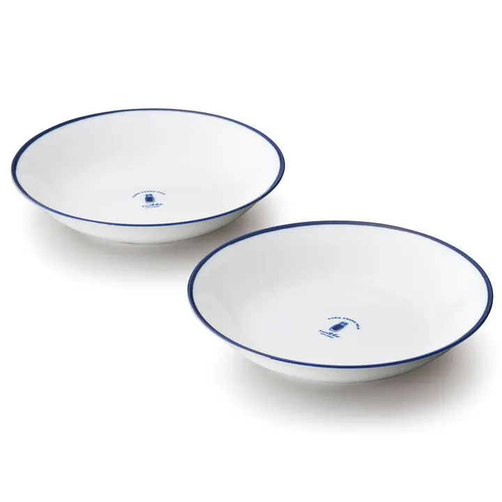 牛乳瓶モチーフのロゴがついたシンプルなデザインのプレートセットです。 お皿の縁のブルーラインが料理のアクセントになります。 手ごろなサイズのディーププレートはシチューなどの汁気のあるお料理はもちろん、サラダやパスタにもおすすめです。 金色のロゴ箔押しが入った化粧箱入りなのでギフトにもおすすめです。