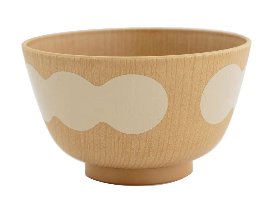 器の内外は欅(けやき)木目がリアルに再現されたナチュラルなシリーズ。 丸が繋がった豆を連想させる柄がほっこりします。 そのデザインからヒントを得た塗装色は、きなこ、あずき、黒豆と命名。 京型という口が開いた形なので、重ねて収納しやすく場所を取らないのも魅力です。 レンジ使用OKですので、日常に使い勝手のいい丼であり他の器との相性も◎。 シリーズ名は「穏やか、円満」を意味する“円(まどか)”の、更に古い語源になった“的か(まとか)”に由来しています。 汁椀サイズもございます。