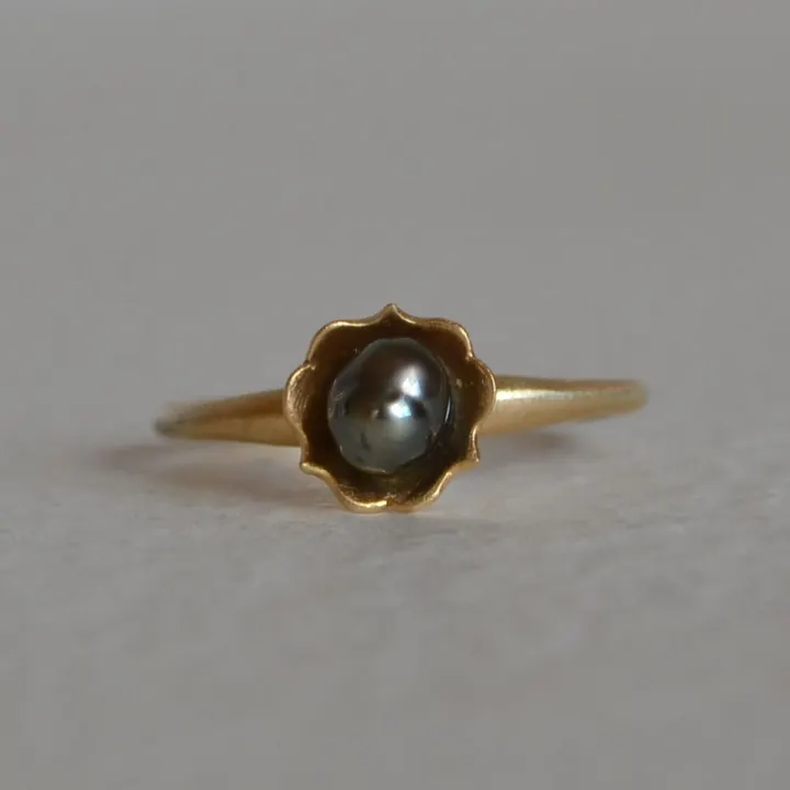 フリルのついた黒蝶ケシパールのリング さりげないデザインがパールを引き立てます