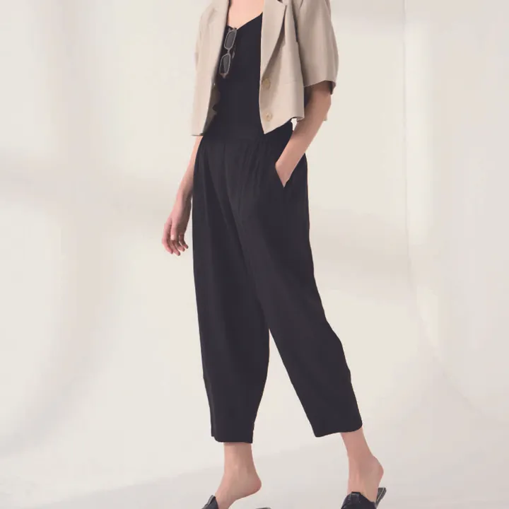 ・通気性の良いリネン素材に、肌触りを柔らかくするためレーヨンを混紡 ・8.5分丈で足首が見えるシルエット、ゆったりとしたバギーフィット ・ウエストは総ゴムで快適にフィット ・前中心にタックと切り替えを入れ、脚長&細見え効果 ・ひざに切替え線、ふくらはぎにダーツ入りで立体感をプラス ・ポケット付きで実用性も◎