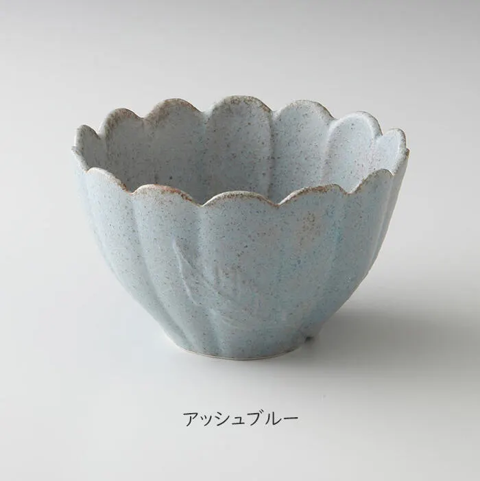 立体感のある花びらのモチーフが可憐な野花シリーズ。 こちらは細かい砂粒を吹き付けたような釉薬が使われています。 不規則なザラザラ感により陰影を作り出し高級感を演出しています。 ボウルLは少し大きなお茶碗サイズです。サラダやスープ、シリアルボウルなど使い方はたくさん! また和洋中、料理を選ばずお使いいただけます。 カラーは3色。どちらも落ち着いた色合いでほかの器と合わせやすくテーブルの素敵なアクセントとなりそうです。 器の一大産地、美濃地方・多治見でひとつひとつ丁寧につくられています。