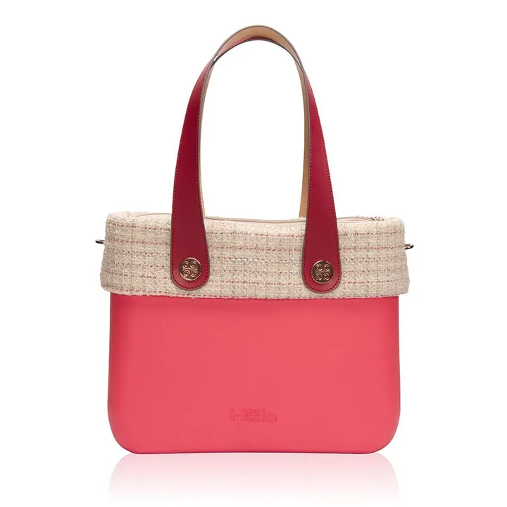 ◆コーディネートのアクセントとしてお使いいただけるピンクのトートバッグ。アイボリーのドレスカバーで甘さのバランスを取り、ツイストリベットは女性らしさの上がるローズゴールドを採用。リバーシブルのフラットハンドルは使い方次第で一気に印象を変えられます。A4サイズが入るトートバッグです。<br>※インナーバッグ付き   ■構成部品 Frame:Pink Punch Flat Handles : Bordeaux &amp; Beige Metal Twists:Rose Gold Alma In-Bag - Grey Frou-Frou : Ivory