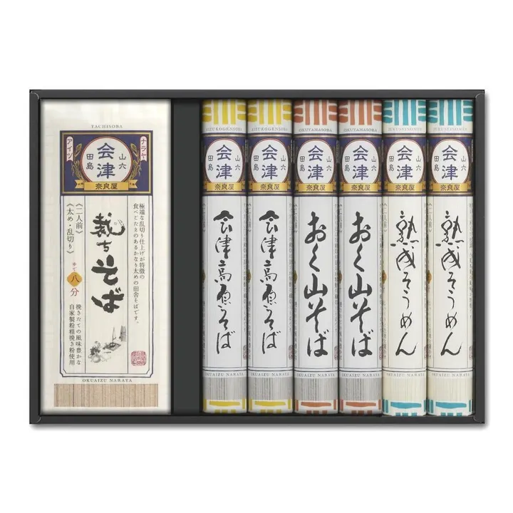 裁ちそば200g×3束 会津高原そば200g×2束 おく山そば200g×2束 熟成そうめん200g×2束 包装・のし掛けも可能です。 別途紙袋をおつけいたします。