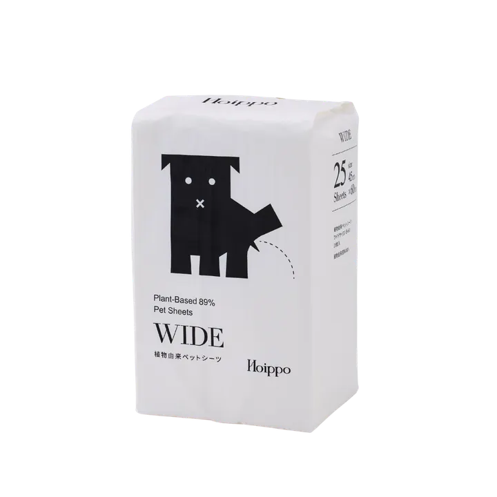 日本国内初*、植物由来原料89% 環境はもちろん愛犬愛猫にも優しいHoippoのペットシーツをリニューアルしました。 第二弾は一年間の試作を経て、速乾性・吸収率共に第一弾より約2倍アップ。 一年間販売してきた中でお客様にいただいたお声を参考に、インクをさらに減らしたエコパッケージにしました。 *自社調べ 商品の特徴 1.植物由来原料採用 ※生分解性100%ではありません 2.CO2の削減に繋がる 3.国産高吸収ポリマー採用 4.四隅にずれ防止シール付き 5.薄型高吸収タイプ 【植物由来原料採用】 通常ペットシーツに使用される石油由来のポリエチレンを使わず、植物由来の生分解性プラスチックであるPLA(ポリ乳酸)をシーツに使用。 植物由来のプラスチックは、通常プラスチックの中で最もCO2の排出が少ないといわれています。 その他、表面にはコットンを使用。愛犬愛猫の触れる部分には全て優しい素材を採用しています。 【高い機能性にこだわりました】 シーツのズレが心配な飼い主の方も安心いただける、四隅にずれ防止シール付き。 国産の高機能ポリマーを採用し配合のバランスを調整。 トイレしたそばから手足がビチャビチャにならない速乾性と吸水性はもちろん必須です。 薄型でかさばらず、持ち運びにも便利です。