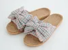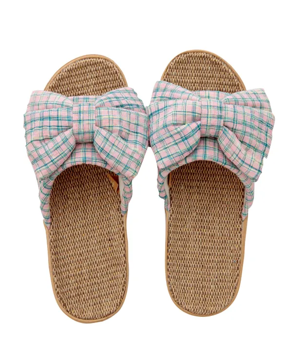 中綿入りのぷっくり立体リボンをあしらった、夏向け生地の軽量スリッパができました。 チェック×リボンのフェミニンデザインが甘くなりすぎないように、柄と色合いで大人っぽく仕上げました。 反対色の経糸と緯糸で織り上げた凹凸のある涼し気なサッカー生地は、どこか素朴な雰囲気がありインテリアに馴染みます。 インソールはサラッと気持ちの良いジュート生地を採用。 今年の夏は足元にポイントのあるリボンスリッパはいかがですか?