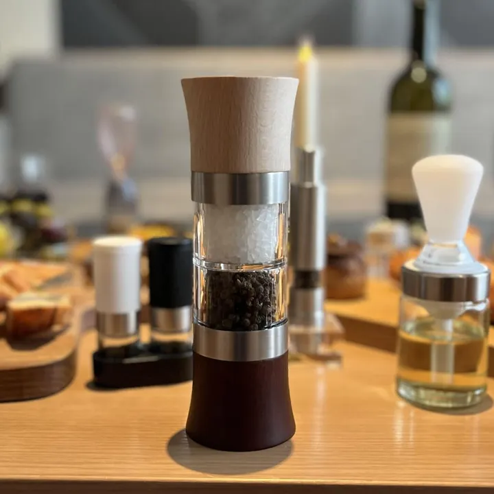 2種類のスパイスを1本に入れる事が出来る2 in 1タイプのソルトペッパー/スパイスミル。中身のスパイスはアクリル窓で確認可能。ダイヤル式のセラミック刃を採用し、粗さの調節ができます。軽くて機能性に優れ、ビーチウッドを使ったナチュラルなテーストはどんなインテリアにもマッチする落ち着いたシンプルデザインです。