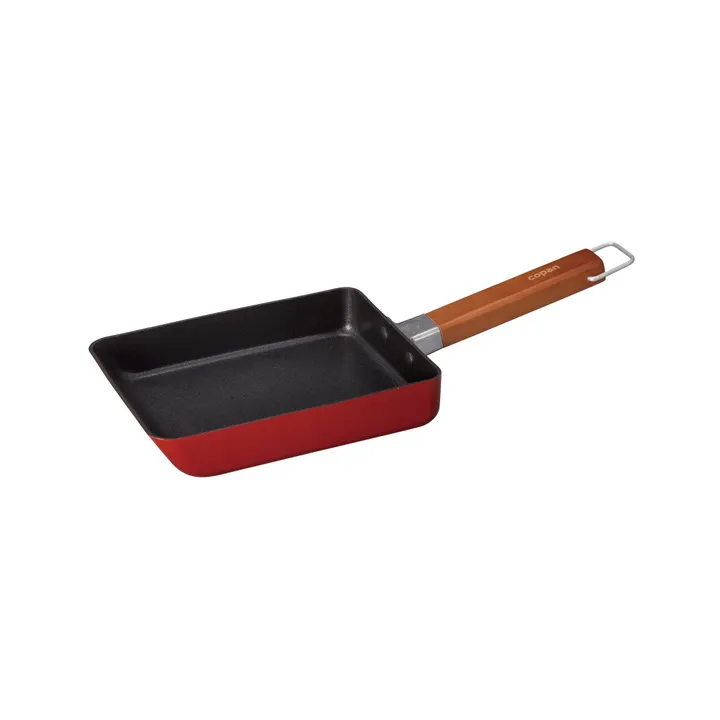 厚焼き玉子や玉子焼きをサッと作るのにちょうどいい、IH対応ちょこっと玉子焼きパン。家族のお弁当用や、1人分の玉子焼きにピッタリです。前面の傾斜はフライ返しが差し込みやすく、深型にもなっているので、食材がこぼれにくい。お弁当の具材を足したいときも扱いやすい。内面はふっ素加工なので、柔らかいスポンジと中性洗剤で洗い流すだけ。汚れが付きにくく落ちやすい。軽量で扱いやすいので疲れにくいのも特徴。シンプルで飽きのこないデザインで、ちょこっとシェフ気分が味わえます。吊るして収納できるので、気軽に毎日の料理をもっと楽しみましょう。