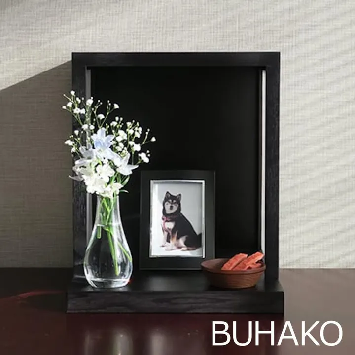 Made in Aomoriの木工ブランド「BUNACO」のコントラクト向けライン「BUHAKO」。 曲線的なデザインの「BUNACO」に対し「BUHAKO」は直線的なデザインが特徴です。 両サイドから光を取り込むデザインのBUHAKOメモリアルボックスに 巻きが美しいメモリアルポット(骨壺カバー)や、お供えプレートを合わせてお使いいただけます。 本体サイズ:375×300×H450mm ステージサイズ:375×125×H40mm カラー:ダークブラウン 素材 本体・ステージ:天然木(タモ材、突板貼りMDF) ウレタン塗装仕上げ 側面:アクリル(乳白色) 原産国:日本 ※ イメージ画像内のメモリアルポット(骨壷カバー)、お供えプレート、フラワーベース、フォトフレームは含まれません。 ※ お手入れは、水をしぼった柔らかい布でお拭きください。破損の原因となりますので水に浸さないようご注意ください。 ※ 限りある資源を大切にしロスを減らすために、材料の選別をせずに製作しています。杢目や節、色みなど風合いが異なる天然木ならではの表情をお楽しみください。 ※ 手作業で製作しているため表記サイズより若干の誤差が生じる場合があります。