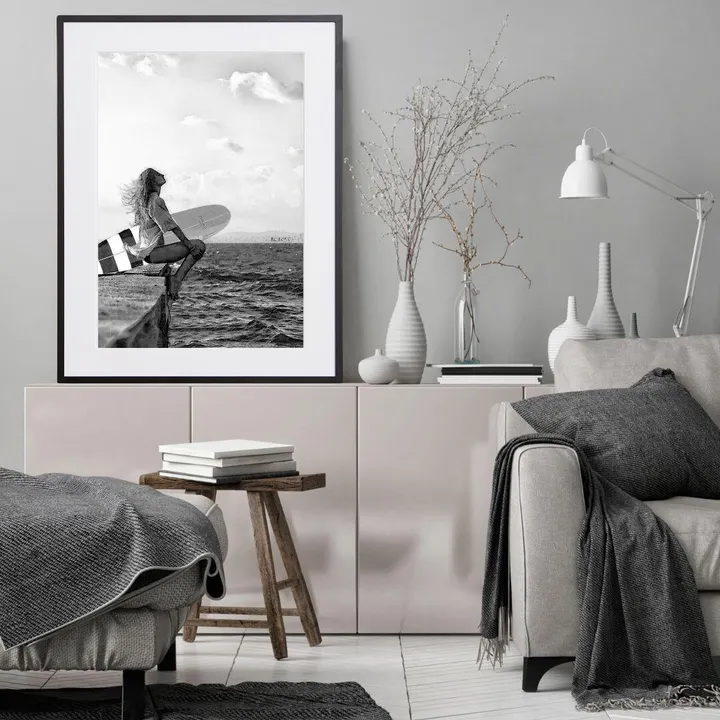 【現代アートポスター】サーフィンガール 海 波 モノトーン A3(M) フレームセット:黒 40.0×51.5cm