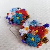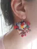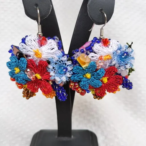 サイズ:約φ4~5cm フック部分含む最長約5.5cm 色鮮やかなお花のモチーフに様々なビーズなどをちりばめたピアス 耳元で華やかでキュートにお顔周りを彩ります。 トルコの伝統手芸 oya 起源は不明らしいのですが、大昔は 魚を捕る網がすでにその技法だったといわれています。 イスラムの女性たちは髪を隠すためにスカーフを覆います。 はるか昔に使われていたその技法が、イスラムの文化圏でスカーフの縁どりに 装飾されおしゃれを楽しむようになったようです。 オヤはトルコ語で縁飾りを意味します。 技法や手法によって呼び名が変わるそうです。 針を使う技法、かぎ針を使う技法 または、ビーズや石などを編みこんでいる手法など。