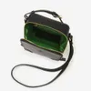側面底部から大きく開くファスナー式メインコンパートメントには、荷物を取り出しやすくするためのマチ付き。 鍵など小さい貴重品は内部のファスナーポケットに。 スマホなどすぐ取り出したいものは、背面のオープンポケットが便利。 ショルダーベルトは持ち方によって長さの調節が可能です。 シンプルな作りながら、収納力もキープ。内布の緑色がアクセントになり、コーディネートの一役に。