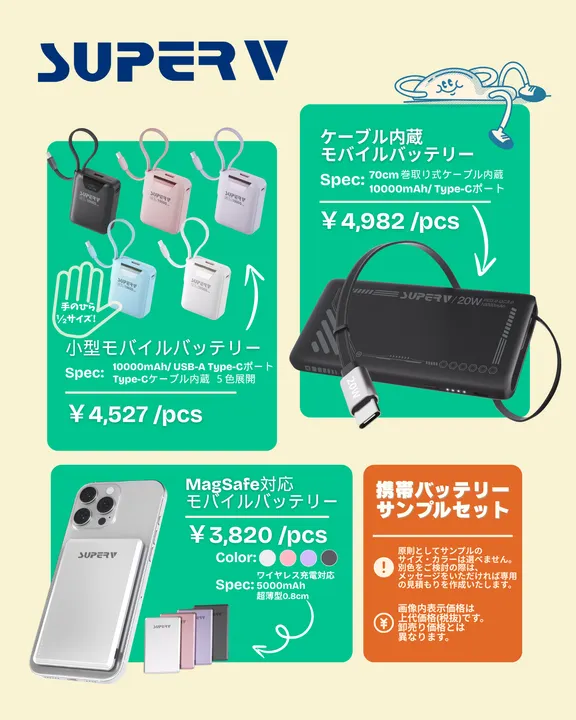 『Life Should Be Easy.(暮らしをもっと簡単に)』 モバイルアクセサリーブランド「SUPERV」の中でも、 その圧倒的な「コンパクトさ」と「利便性」で、 実店舗での指名買いやギフト需要が非常に高い モバイルバッテリー3種を、1つのサンプルセットにまとめました。 本製品は、卸売ご検討中のバイヤー様向けに、 実際のサイズ感・重量・質感・パッケージデザインを 手に取ってご確認いただくための特別なセットです。 画像に記載の通り、各製品のスペックや上代価格を ご確認の上、貴店での展開イメージにお役立てください。 セット内容(各1点) 1. 小型モバイルバッテリー(Power15) スペック: 10,000mAh / USB-A & Type-Cポート / Type-Cケーブル内蔵 特徴: 手のひら1/2サイズ。5色展開のパステルカラー。 価格: 4,527円(税抜上代) 魅力: 「大容量は重い」という常識を覆すサイズ感で、 女性層やミニマリスト層へのアプローチに最適です。 店頭でのカラーバリエーションの華やかさはアイキャッチ効果も抜群です。 2. ケーブル内蔵モバイルバッテリー(Power14) スペック: 70cm 巻き取り式ケーブル内蔵 / 10,000mAh / Type-Cポート 価格: 4,982円(税抜上代) 魅力: 「ケーブルを忘れる・絡まる」というストレスを物理的に解消します。 これ一台で外出準備が完結する利便性は、 ビジネスマンや旅行用品コーナーでの需要を強力に誘発します。 3. MagSafe対応モバイルバッテリー(Power4) スペック: 5,000mAh / 超薄型0.8cm / ワイヤレス充電対応 特徴: ホワイト、ピンク、パープル、ブラックの4色展開。 価格: 3,820円(税抜上代) 魅力: スマホと一体化する薄さは、充電しながらの操作を妨げません。 スタイリッシュなガジェットを好む層や、 iPhoneユーザーへの洗練されたギフトとして選ばれやすい一品です。 【重要】サンプルセットに関する注意事項 画像内表示価格について: 記載されている価格は「上代価格(税抜)」です。卸売り価格とは異なります。 カラー・サイズについて: 原則としてサンプルのカラー・サイズはお選びいただけません。 個別見積もり: 別色をご検討の際は、メッセージをいただければ専用の見積もりを作成いたします。 SUPERVブランドについて SUPERVは2017年に香港で創業した高品質充電アクセサリーブランドです。 革新的な技術とユーザーフレンドリーなデザインで、 世界中のユーザーに信頼と利便性を提供しています。 Marcys Storeからのご提案 Marcys Storeは、SUPERVの日本正規代理店です。 モバイルバッテリーはスペックだけでは伝わりにくい 「持ち心地」や「操作性」が購入の決め手となります。 ぜひ本サンプルセットで、SUPERVが追求する「使いやすさ」をご体感ください。 パッケージを含め、貴店の棚割りに馴染む高品質な仕上がりとなっております。 本格導入に関するご相談も心よりお待ちしております。