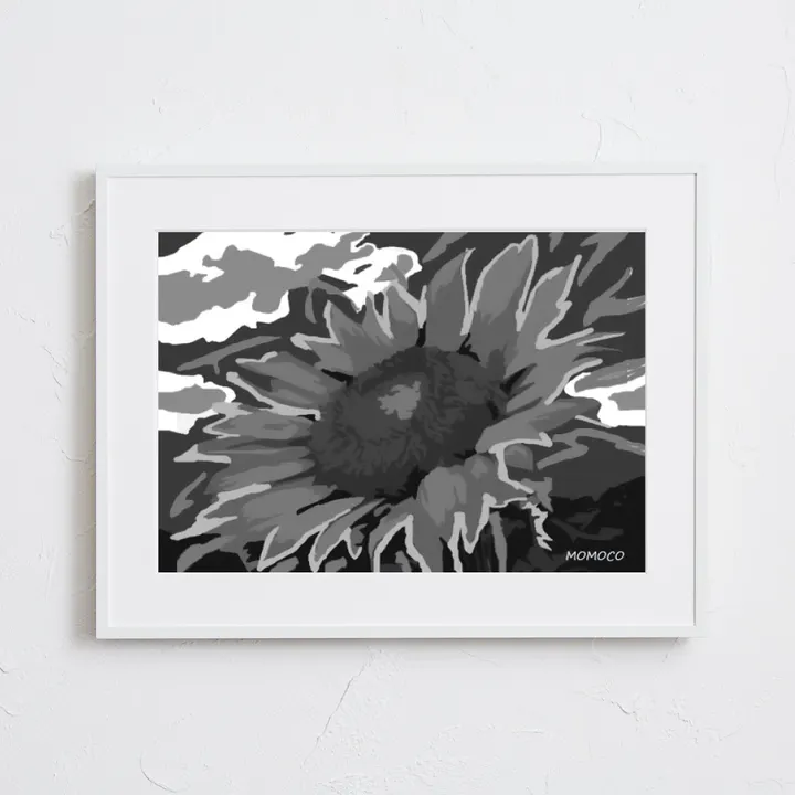 アーティスト -PROFILE- MOMOCO(モモコ) 「色」をこよなく愛する画家、ライブペインター。 躍動感あるアートにも関わらず、服を一切汚さず短時間で音楽と同時に描き上げる。そのパフォーマンスと巨大アートは観る人を魅了する。 前職は某有名ファッションブランドにてデザイナーとして活躍。その経験の中で養われた「色とデザイン」の絶妙なバランスを活かしつつ、トレンドを取り入れ進化し続けるアートを目指す!国内外問わず、精力的にアートと向き合い発信を続けている。 【作品について】 夏のシンボルでもある向日葵をあえて、モノトーンに モダンなインテリアや白黒好きの部屋にも相性の良い作品です 作品名:himawari Ⅴ 手法:デジタル、イラスト ペーパー:高品質半光沢紙 マットカラー:白 マット*:DXホワイト芯 100%バージンパルプ/PH7・中性紙(2mm厚) ※全てのアートにマットがつきます フレームカラー:黒、白、無垢(3種類から選択) ※マット付のため通常とはフレームサイズが異なる規格となります。 【マット*とは?】 アートポスターの周りに挟んだ厚紙の事。 マットを使わない時に比べ余白により広がりが生まれ、作品の新たな一面を引き出せ作品の見栄えがグッと良くなります。また、額縁のガラス面と作品が直接触れたままにしておくと、くっついて作品を傷つけることがあります。マットを使用することでガラスと作品の間に空間ができ、作品を保護することができます。ブランドコンセプトにより全てのアートにマットがつきます。 ー ファッションのようにアートを ー 私達が掲げるコンセプトです! 毎日着替えるファッションの様に、アートも気軽に飾り変えて欲しい... 一旦飾り終えたアートにも光を当ててほしい... ポスター単体、またはリピートで中身だけのポスターを購入された方に"専用のハンガー"をセットでお届け。 「今までに無い!新しいアートの飾り方を提案」 飾る事がなくなった前のアートをハンガーにかけて洋服と一緒にかけてもらう。 その日の気分や、モチベーションですぐに取り換えられる様に。 もちろん、魅せる収納としても今までにないおすすめの飾り方です。