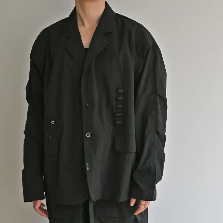 ミニマルと機能性が共存するテクニカルテーラードジャケット。 クラシックなテーラードの佇まいに現代的なギア要素を落とし込んだハイブリッドジャケット。 シワ感のある軽量ナイロン素材がきちんと感に抜け感をプラスし、 都会的なムードを纏わせます。 フロントには立体構造のポケットを配し視覚的アクセントと実用性を両立。 セットアップ対応パンツとのコーディネートでストリート×モードな空気感を演出します。 オンにもオフにも溶け込む “使える” 新定番テーラード。 <モデル着用> Men’s 身長183cm Mサイズ Ladies 身長163cm Mサイズ ~撥水機能素材~ 撥水加工を施した生地を使用しています。 水滴や軽い雨を弾くため、天候の変化にも安心して着用いただけます。 [快適性]通気性を保ちながら水をはじくため、ムレにくく快適な着心地。 [機能性]アウトドアやタウンユースなど幅広いシーンで活躍。 撥水加工により汚れが付きにくく、お手入れも簡単。 ※完全防水ではありませんので、長時間の雨天や強い水圧下での使用にはご注意ください。 ~耐光素材~ 日光や照明による退色・劣化を軽減し、美しい色合いや質感を長く保つことができます。 紫外線などの光に強く、カラーを維持。 [耐久性]長期間の使用でも風合いを損ないにくい。 屋外や日当たりの良い環境でも安心してご使用可能です。 ※ご使用環境や経年によっては多少の色変化が生じる場合があります。 ~汗堅牢度~  汗に含まれる成分による色落ちや色移りを抑える品質確認を行っており、 日常の着用シーンでも安心してご使用いただけます。 [色落ち防止]汗による変色や退色を軽減。 [衣類保護]他の衣類や肌への色移りを抑制。 [品質保証]日本工業規格に準拠した試験で確認済み。 ※ご使用状況や経年により、多少の色変化が生じる場合があります。 【NoiR 販売価格について】 弊社設定上代(税込価格)での販売のご協力をお願いいたします。 また、商品に対してのクーポン等はご遠慮いただいております。 ショップ全体でのクーポン等は問題ございません。 ご理解・ご了承のほどお願い致します。