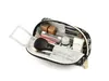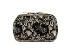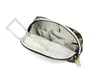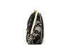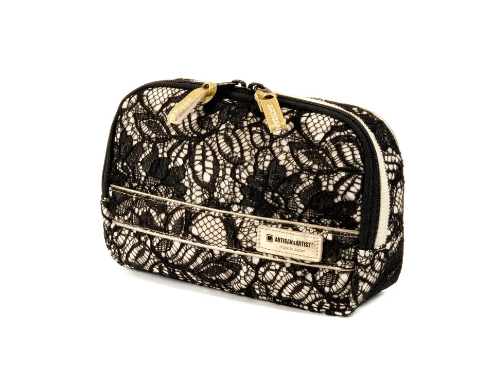 繊細なレースが上品さを際立たせるポーチシリーズ。太さの異なるマットブラック糸を組み合わせて表情豊かに編んだレース柄は、一般的なレースよりもコントラストのある表現力が特徴。 ベース生地の明るく華やかな色調のシャンパンゴールドとの組み合わせにより、品のある美しさが際立つデザインになっています。裏地には表の雰囲気に合わせて、落ち着いたアイスブルーを使用しており、シンプルでシーズンレスです。 トップからの斜めのカッティングにより、スマートかつコンパクトでありながらも、十分な収納力を実現しました。 ファスナーを開くとフロント部分の上半分が手前に倒れるつくり。中身が見渡しやすいうえ、中に入れたアイテムの出し入れもスムーズです。 ポーチを開くと、手前に2つのブラシホルダー。ファスナー開閉時に毛先を挟み込まないよう、太めブラシ用ホルダーはポーチ下部側に配置しています。ホルダーの口元はゴム入りで、ブラシをしっかりとホールド。ビニール製の下敷き&フラップも付いており、繊細な毛先とポーチ内の衛生をしっかり守ります。 ポーチ内部背面にもスティックアイテム用ポケットがついています。 ホルダーとポケットの向き・位置は、手前と奥とで交互に配置。こうすることで、ファスナーを閉じたときにアイテムの厚い(太い)部分同士が重なるのを防げ、スペースを有効利用できるようになっています。