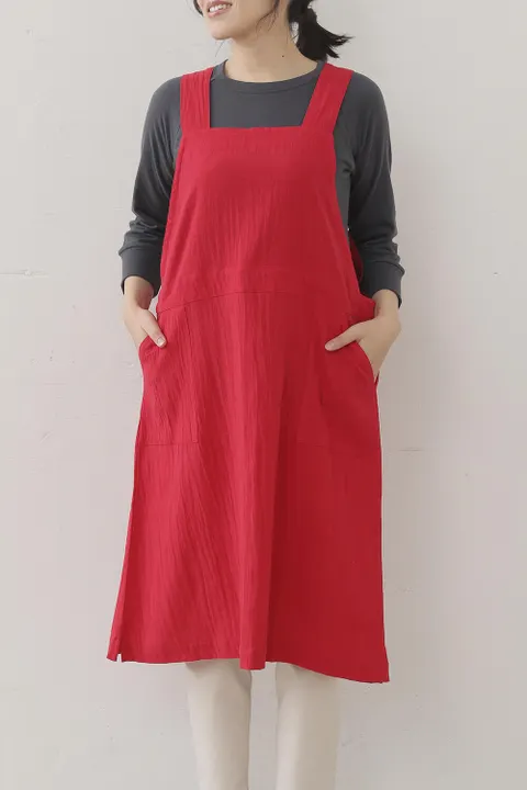 ハウスワークの途中のちょっとした外出もOK。 アトリエヌイらしい色合いと軽やかな着心地で暮らしを楽しく。 遊び心溢れるオーバーオール風のワンピースエプロン。