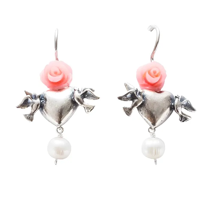 Aretes Dulzura|ハートと鳩のピアス(シルバー・パール・レジン)