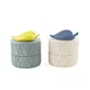 レジン素材で作られたフタに鳥のモチーフをあしらったキャニスター。 蓋の上には立体的な鳥モチーフが施され、指輪やピアスなど、いつも身につけるアクセサリーの置き場所に。 本体の側面には糸巻きを思わせる凹凸模様が施されており、光を受けることで柔らかな陰影が生まれる表情豊かなデザインが特徴です。 アクセサリーだけでなくデスクまわりの細かなものを整理したり、見せる収納として飾ったりと、インテリアとしても楽しめるアイテムです。 *デザインボックス入り