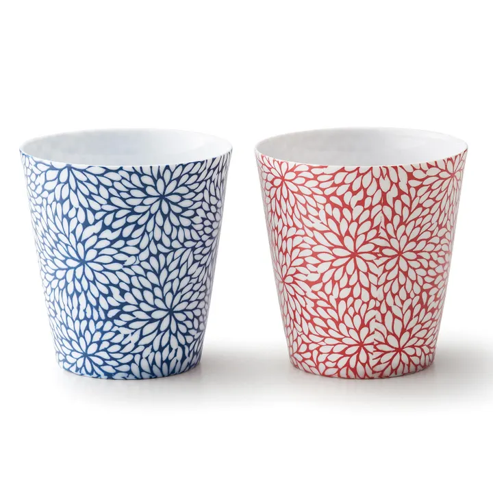 羽衣のように薄い繊細な磁器に、和モダンな菊の吉祥文様を立体的に絵付けしたフリーカップです。その薄さは色付きの飲み物を入れるとほのかに透けて見えるほど。 約1mmと極限まで薄くした飲み口は口当たりが良く、飲み物の冷たさ・味・香りを存分に楽しむことができます。 REDとBLUEの2個組です。 【おすすめ用途】 引出物、引き出物、結婚祝い、結婚内祝い、引越し祝い、新築祝い、ノベルティ、景品、賞品、プレゼント、贈り物、誕生日、お返し、ご挨拶品、父の日、敬老の日、お中元、お歳暮、御礼 、土産、インバウンド、お正月などの和のおもてなしに