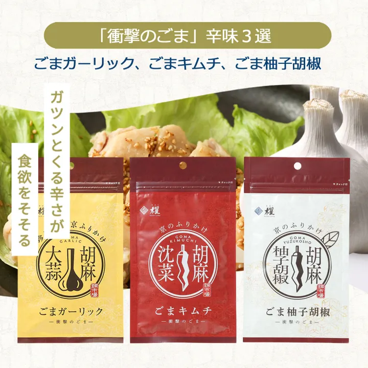 ごまガーリック40g|ごまキムチ40g|ごま柚子胡椒40g 各1個 ”珍味処の京ふりかけ”「衝撃のごま」ふりかけシリーズ_辛味3選をお試しでご注文いただけます。 ゆうパケット(ポスト投函便)でお送りいたします。 ※日本全国一律:300円(税込) 【売上ランキング】 1.ごまかつお:56.2% 2.ごまわさび:10.4% 3.ごまゆず:9.6% 4.ごまガーリック:8.7% 5.ごま柚子胡椒:6.0% 6.ごま梅:5.5% 7.ごま三彩:2.0% 8.ごまキムチ:1.6% ※弊社店頭では購買層の60%が外国人観光客 ※三彩・キムチは、有効スペース外で販売