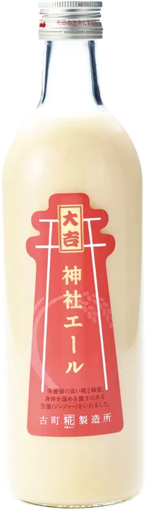 米と米糀で作られる糀甘酒に、生姜汁を配合した商品。 糀の力でお米の甘みを引き出し、お米由来の豊かな甘みを感じることができます。 ノンアルコールの商品ですので、小さなお子様から年配の方まで幅広い方に飲用していただけます。 通年取り扱っている「神社エール」という品物と、冬季限定の「神社エール大吉」の2種類の生姜甘酒がございます。 「神社エール大吉」は年末年始限定で提供している、神社のご祈祷を受けた縁起ものです。 レシピも少し異なっており、「神社エール」に比較して生姜の配合割合が多くなっております。