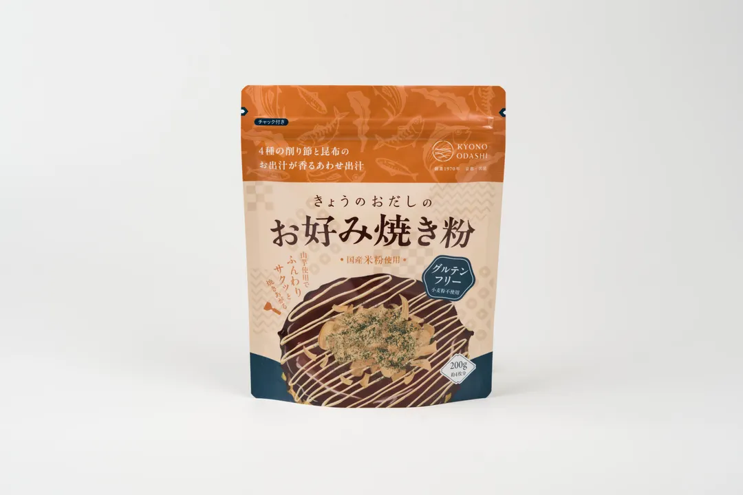 4種の削り節と昆布を使用することで豊富なうま味と芳醇なお出汁の香りを楽しめます。 国産米粉を使用していますので、小麦アレルギーをお持ちの方や、グルテンを避けたい方にぴったりです。 ふんわりサクッとした食感を味わっていただくため山芋粉もふんだんに使用しています。 化学調味料・膨張剤など、添加物一切不使用のお好み焼きをお楽しみください。