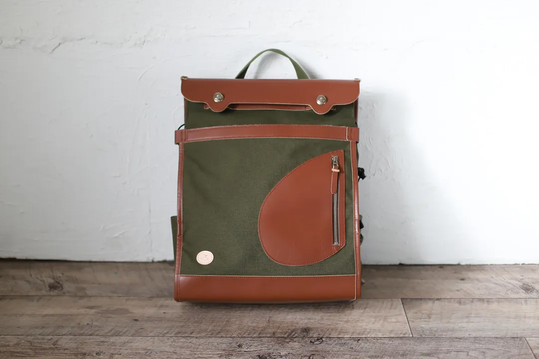 ---DUOシリーズの大容量リュックサック--- 撥水生地CORDURAと防水レザーを使用したアウトドア仕様の大容量リュックサック。 ---「ガバッ」と開くオリジナル設計--- 郵便配達員が使用するポストマンバッグをイメージ。 独自設計によりガバッと開口を実現しました。 ---大容量を実現するドイツホック--- オープンカーの幌を固定するために使用されているドイツホック。 荷物を多く詰めても弾けたりすることはありません。 ---多次元のカーゴポケット--- フロント部分にカーゴポケットを搭載。 ゴム製のコードで簡単に調整可能です。 ---財布と鞄が一つになる--- 専用のホックでリュックにDUOウォレットを取り付けることができます。 荷物がいっぱいでも財布を見失うことなく、お会計ができます。 ---お手入れカンタンなパッド--- 汗をかきやすい背面、ショルダーのパッドを取り外すことができます。 取り付けもしやすくカンタンにお手入れできます。 ---安定の収納力--- 大容量リュックサックにはかかせないサイドポケットを搭載。 フロント部分にはDポケット リュックの内装にはファスナーポケット ---CORDURA®×防水レザー--- 防水機能を持った牛革と撥水生地CORDURA®のコラボレーション。 鞣しの段階で3Mのスコッチガードを革の内部にまで浸透させた牛革。 生地はCORDURA®の定番CORDURA1000を使用しています。