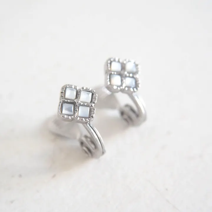 イヤリング【Vintage】白蝶貝ミニフラワーモチーフイヤリング ブルーレースアゲートと白蝶貝 天然素材が織り成すパステルトーンの世界 淡い水色と白が層状に重なり、繊細なレースの様に見えたり 穏やかな空模様を切りとったようにも感じられるブルーレースアゲ―トと パールのような美しい艶のヴェールを纏う白蝶貝 ふたつの天然素材が織りなす柔らかな雰囲気を どこか懐かしさ漂う空想のフラワーモチーフに込めました パステルカラーの優しく清楚な色味の調和が楽しめる 可憐な表情のシリーズです ////////////////////////////// 柔らかく上品な光をまとう 「マザーオブパール・白蝶貝」の魅力 ////////////////////////////// こちらのアイテムでメインの素材として用いたのは 「マザーオブパール」と呼ばれる真珠をつくりだす母貝、白蝶貝。 母貝にはいろいろな種類があることからマザーオブパールにも様々な色調が存在します。 パールのような美しい照りと光沢があり、透明だったり模様の斑だったり。 幾重にも重なる層が一つ一つ異なる表情で輝きます。 この白蝶貝の柔らかなトーンの乳白色は上品でナチュラルな雰囲気も併せ持ち、 アクセサリーやジュエリーだけではなくボタンや時計の装飾などの日用品としても用いられています。 ◆詳細◆ 天然素材のシェル・白蝶貝を花弁に見立てデザインした、小ぶりで可憐な佇まいのフラワーモチーフ。 前作のブルーレースアゲートのフラワーモチーフでアクセントとして用いた小さなスクエア型の白蝶貝を主役に 日常手に取りやすいコンパクトなサイズ感にこだわり表現しました。 白蝶貝はパールをつくるための母貝でもあり、 その素材からのパールのような美しい照りや特別感のある光沢が特徴的。 ホワイトカラーでありながらその一つひとつは柔らかくほんのりとした虹色のツヤをまとい、上品でさりげない光を放ちます。 その4粒をぎゅっと寄せ集めたニュアンスたっぷりな白蝶貝の澄んだ輝きを、 モチーフを縁取るミル風の刻みや花芯の凹凸を丁寧に施した石枠のメタリックなシルバーカラーの輝きと織り交ぜ 細やかな加工によるヴィンテージのような風合いもしっかりとプラスし仕上げました。 どこか懐かしくロマンチックなムードも感じられる愛らしい小花モチーフをクリーンなカラーリングで引き締めた、 Oucaらしいオリジナリティが光るひとしなです。 こちらはモチーフのデザインをシンプルに楽しめるイヤリング。 約9mmほどと小ぶりなモチーフは直線的なフォルムで凛とした端正な佇まい。 ホワイトカラーとシルバーカラーのクリーンなムードが甘さを抑えながら 装いを上品に彩り、お顔周りを明るく見せてくれます。 金具はクリップタイプ。 シリコンカバーも装着しやすく、快適にお使いいただけます。 ピアスタイプ(EN170P)もございます。 商品には専用のBOXが無料で付属しますので、ギフトにも最適です◎