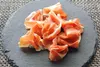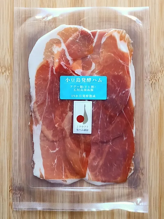 こちらの商品は、生ハムスライスパック50g入りです。 薄くスライスした生ハムを並べ、一段毎に透明シートを挟んでありますので、剥がしやすくなっています。 南ぬ豚は「ぱいぬぶた」と読み、沖縄八重山地方の方言です。南ぬ豚は石垣島で育ち、アグー豚のF1種(雄の沖縄アグー豚と雌の西洋豚を掛け合わせたハイブリッド)で、沖縄県により管理、登録された豚です。 沖縄アグー豚は、繊維がきめ細かで、脂肪の融点が低いのが特徴で、特にオレイン酸が三元豚と比べ3~4%高い為に口溶けが良く、生ハム向きの豚肉と言えるでしょう。南ぬ豚もその沖縄アグー豚の形質を受け継いでいます。 南ぬ豚の特徴は、地域循環農業から出てくるパイナップルの絞り残渣を発酵させたものを与えている事です。それにより、より脂肪が柔らかく肉は甘くジューシーになります。 当工房の南ぬ豚の生ハムは、流通上の理由により日本ではあまり作られていない、蹄と皮つきです。これは本場スペインでの形態と全く同じものです。蹄と皮がついている事で、塩漬けや乾燥熟成が過度に進行しないので、脂肪がジューシーで肉質が均一な傾向に仕上がります。 当工房の製法(醤油麹菌と白カビの2段階発酵)で作る生ハムは、うま味が強く、食味的には甘く感じるのですが、南ぬ豚はより上品なうま味(甘味)が口の中にふわっと広がり、しばらくは余韻が残ります。その奥にはどこかパイナップルのフルーティさも感じられる事もあるでしょう。発酵の香りと相まって、初めて体験する様な生ハムに仕上がっています。
