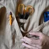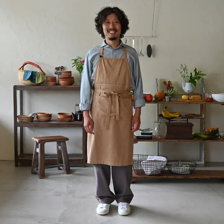 ヴィンテージワークウェアの雰囲気を随所に盛り込んだベーシックなエプロンは、どんなシーン、どんな人にも合う汎用性の高さが魅力。 パートナーとのシェアもおすすめ出来る1枚です。 「フリーサイズへのこだわり」 150cm~180cmまでさまざまな体型のシサムスタッフが着用し、辿り着いたフリーサイズは着る人を選びません。 自分用はもちろん、プレゼントにもお店のユニフォームとしても、フェアトレードを気軽に取り入れていただけます。 外仕事もしやすいよう、しゃがんだ時に床につかない丈にしました。 首紐の長さは3段階に調節可能。 自然素材のコロゾナッツボタンがポイントです。 腰周りの布はジャストでもゆるく結んでも。 体型や服に合わせた着こなしが楽しめます。 「まるでお仕事用のウエストポーチ」 腰部分に配したテーブルワイプホルダー。 セットで展開しているテーブルワイプはもちろん、お手持ちのタオルを通してお手拭きにも。 ゴミが溜まりにくいよう、角を落としたポケット。 さらに前ポケットの中には、スマホ用のポケット、ペンホルダーとはさみホルダーもご用意しました。 一見シンプルに見えて、お仕事用のウエストポーチをつけているような安心感。 モノがポケットの中で泳がないことは想像以上に快適です。 「ステップステッププロジェクト」 sisamのパートナーであるCreative Handicraftsの生産者の多くは、インドのスラム街で暮らす女性たち。 最初はエコバッグや巾着など、比較的簡単な縫製から技術を学んでいきます。 直線縫いからカーブ縫いへ、裏地無しから裏地付きへと少しずつ技術習得をしていくなかで、 小物と服の間に、もう一つステップを作ることができたら。 このエプロンの開発には、そんな大切な理由も込められているのです。 一歩一歩、着実に技術の階段を登ってもらいたいという思いを込めて、「ステップステッププロジェクト」と名付けました。 このエプロン企画は、25周年を迎える私たちsisamのものづくりの在り方を再考するきっかけとなりました。 生産者と私たちの新たなステップステップを、ぜひ一緒に体感してください。 「長く長く大切に使えるものを」 毎日使っていると擦り切れやすい生地端部分は、生地の裏打ちと太番手コットン糸のステッチでしっかり補強。 力がかかりやすい部分にはかんぬき留めを施しました。 私たちはものを長く長くご愛用いただけることもエシカルだと考えています。 作る過程も使う過程もエシカルに。 自分だけのヴィンテージに育っていくのも楽しみですね。 「土に還る素材」 オーガニックコットン生地、コットン糸、コロゾナッツボタンと、全てのパーツが天然素材。 お洗濯の際にマイクロプラスチックを排出しません。 洗濯回数が多いエプロン、そんなところにも配慮しました。 「日常に馴染む3色」 昔からの工場が立ち並ぶ東大阪市で、染色を担ってくれているのが福井プレスさんです。 インドのものづくりと日本のものづくりが重なったエプロン。 手から手へと時間をかけてじっくりと形になりました。 生地は、オーガニックコットンを100%使用しています。 私たちの肌の心地よさだけでなく、地球環境や作り手の暮らしを守る選択肢を。 コットンの栽培法のなかで、今は全体で1%ほどのオーガニック農法が世界に広がっていきますように。