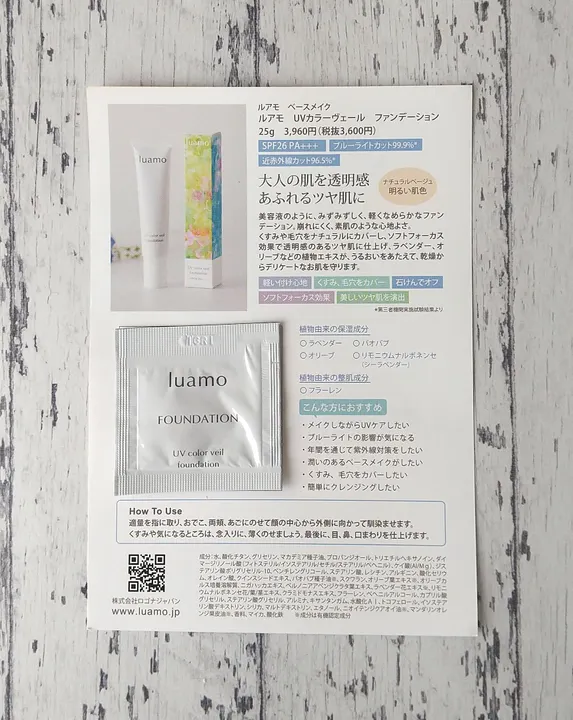 販促にお使いいただけるサシェ(試供品)です。 サシェを製品特徴と使用方法を掲載したA6(はがきサイズ)台紙に貼り付けています。 ========================= 【くすみ、毛穴カバー・ソフトフォーカス作用・美しいツヤ肌】 ●ブルーライト99.9%カット、近赤外線96.5%カット( 第三者機関実施試験結果より) ● 外的刺激(大気中の花粉、黄砂、PM2.5、排気ガスや塵、ほこりなどの微粒子)から肌を守る※ ※保湿・整肌成分によって しっとり、潤いに満ちた輝きで、美容液のように、みずみずしく、軽くなめらかなファンデーション。仕上がり綺麗なソフトフォーカス。日本女性の肌色に合う明るいナチュラルベージュでくすみや毛穴をナチュラルにカバーして透明感のあるツヤ肌に仕上げます。肌に溶け込むようになじみ、崩れにくく、素肌のような心地よさ。ラベンダー、オリーブなどの植物エキスが潤いを与えて、乾燥からデリケートなお肌を守ります。 【プロテクト・保湿 Key成分】 ラベンダー マカデミアナッツ マルメロ(クインスシード) オリーブ葉 オリーブカルス培養溶解質 ニガハッカ アンビューティ(ベルノニアアペンジクラタ) シーラベンダー(リモニウムナルボネンセ) 緑藻(クラミドモナス) フラーレン(植物由来) ○ヴィーガン 【ルアモ ブランド紹介】 ナチュラルで心地よいコスメをご紹介している「ルアモ」。水のようになめらかで白浮きせず紫外線とブルーライトからお肌も守るUV製品と美しい発色の認証オーガニックメイク製品をご紹介している日本ブランドです。 姉妹ブランド、ルアモ ベーシックでは全ての年代の方のためのジェンダーレスなパーソナルケアブランド(ヘアケア、スキンケア)をご紹介しています。 https://goooods.com/brands/0d863104-79b8-4612-aa24-bb0f0f14a581?nth=0 【QUALITY】 わたしたちは、植物のチカラを活かした製品を作り、美しい自然を守ることを大切にしています。 わたしたちの製品には、植物オイルやワックス、ハーブエキス、芳香蒸留水、エッセンシャルオイルなど、オーガニック&ナチュラルな植物原料を使用しています。 ●品質・成分 天然由来成分を使用した製品を作ります。 可能な限りオーガニックの植物原料を使用します。 高品質なナチュラル&オーガニックコスメをお届けします。 ●使いやすさと効果 ナチュラル&オーガニックの品質で使いやすい製品を開発します。 日本人の肌によりそった製品を作ります。 自然のチカラで美しく輝く肌に導きます。 ●人、自然、幸せを「守る」 人々や自然の幸せに繋がる取り組みをします。 環境に配慮した製造方法、パッケージを選びます。 自然と調和した暮らし方を大切にします。 【こだわりの品質基準】 環境にやさしい製品づくり 〇 天然色素を使用 〇 動物実験は一切行いません 〇 製品や植物性成分には放射線処理が施されていません 〇 環境に配慮したパッケージを使用しています 〇 石けんで落とせます フリー処方 × 石油由来の成分 × 石油由来・化学合成された防腐剤(パラベン、フェノキシエタノール) × 合成香料 × タール色素 × パラフィン、PEG、シリコン × タルク × ナノサイズの原料 × 遺伝子組み換え植物