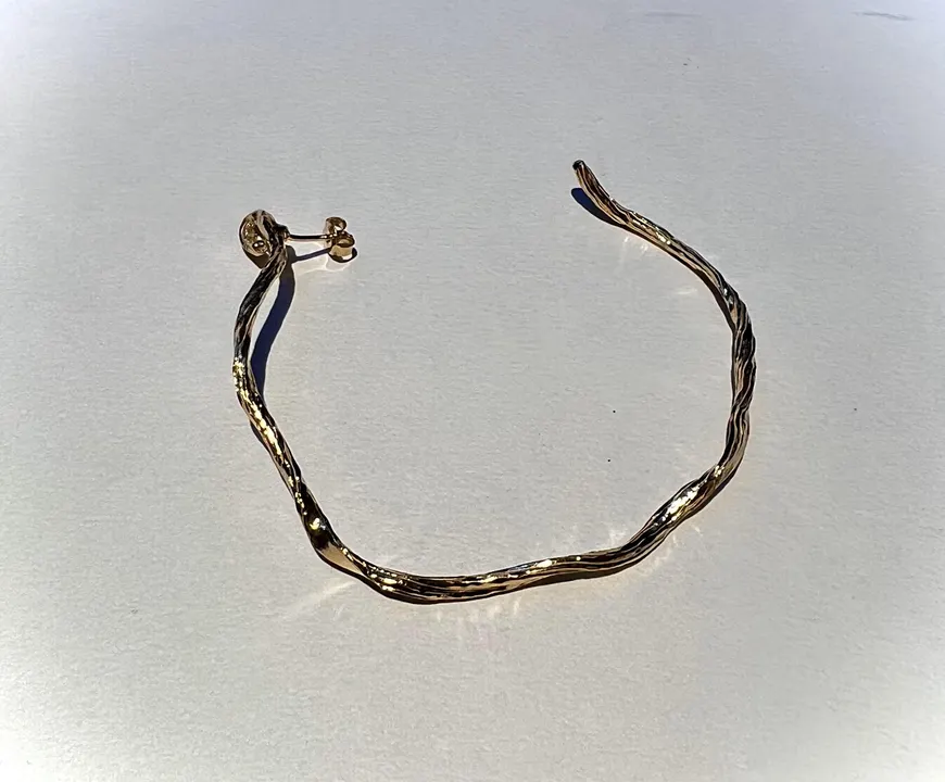 あえて全く同じ形にはせず、少しずつ叩きながら、それぞれの曲がる特性を活かして形造りました。 身に付けることで、自然と調和して生きることを思い出し、その中で生きる人々と繋がっていると感じられるようにとの願いから制作しました。 どんなファッションにも合わせやすく、長時間装着しても疲れにくい様軽量にしています。