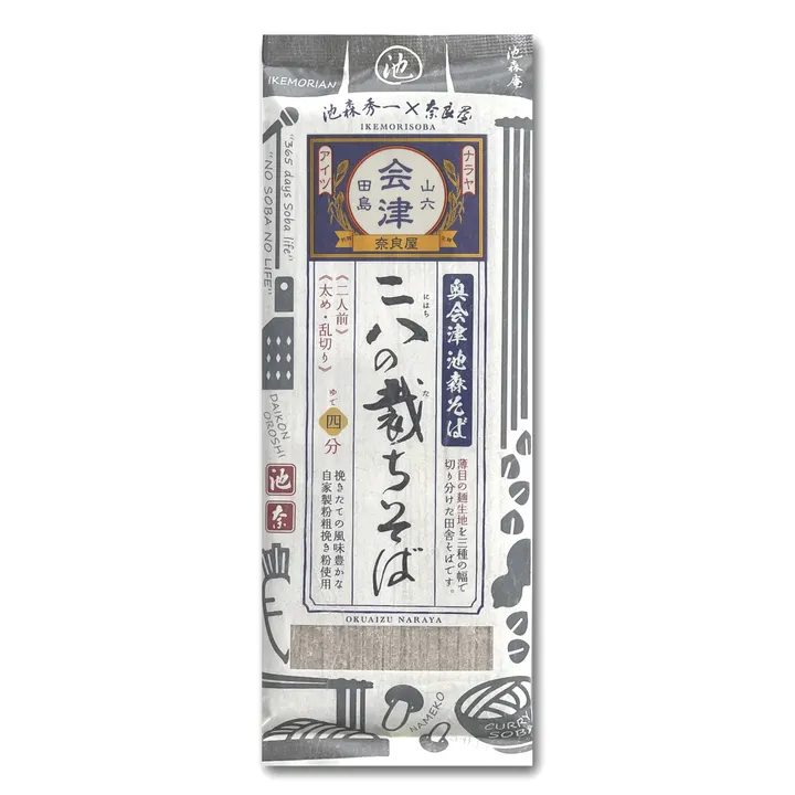 DEEN ヴォーカル池森秀一さん×奈良屋のコラボ乾麺です! ※こちらの商品は、オンラインでの販売禁止商品となっております。 実店舗のみのお取扱いにてお願いいたします。 365日そば三昧歌手としてメディアで話題の DEENヴォーカル池森秀一さんが 奥会津奈良屋と試行錯誤の上に作り上げた逸品です! 自社製粉の粗挽きそば粉を贅沢に八割使用し、 薄目に仕上げた麺生地を、田舎風の手打ちの食感に近づけるため 極端な乱切り仕上げにしました。 そば独特の歯切れ、そば本来の風味をご賞味下さいませ。 《裁ちそばとは》 会津桧枝岐(ひのえまた)では、延ばした麺生地を数枚重ね、包丁で手前に引くようにして切ります。布を裁(た)つように切ることから裁ちそばと呼ばれています。もともと檜枝岐村は貧しい村であったので、つなぎの小麦粉を手に入れることができず、折りたたむと割れてしまうことからこの製法で作られるようになりました。檜枝岐のそば打ちは女性の仕事とされ、「そばを上手に打てないとお嫁に行けない」と昔は言われていました。