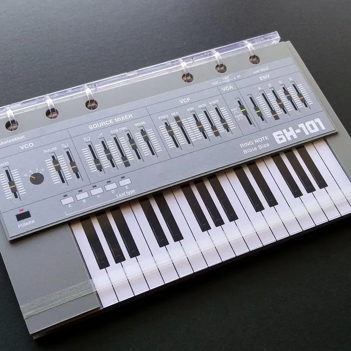 シンセサイザーノート 6H-101です。 シンセデザイン6穴バイブルサイズ小型ノートです。 アナログシンセ名機をイメージしました。 ボディーはグレープラスチック素材を使用。 シンセ感が損なわれないように仕上げました。 ノートは一般的なバイブル(聖書)サイズになります。 ノートとしても手帳としても便利なサイズです。 リングノートなのでリーフの取り外しが自由自在。 シンセサイザーの音色のようにお好きな ノート、手帳にカスタマイズ可能。 ※リングはスライドさせて開くようになっています。 お好みのノートにカスタマイズしてください。 (スケジュールリーフや方眼リーフは別途お買い求めください) <6H-101仕様> 規格:BIBLE (聖書)サイズ 6穴 本体サイズ: W175×D110×H16mm リーフサイズ:171×95mm 表紙材質:R-PP/OPS樹脂 綴じ具 :ABS樹脂 リーフ(無地)40枚付き ※スケジュールや罫線付きのリーフは別途お買い求めください