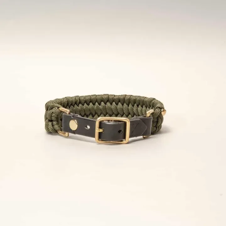 ベルト部分はレザーで作られ、パラコードが編み込まれた幅広デザインが特徴です。 パラコードは耐久性に優れ、犬の首にやさしくフィットします。広めの幅が首に負担をかけず、快適な着用感を提供します。 耐久性の高い素材と丁寧な手作りで、高品質とデザイン性を兼ね備えています。 ▼お手入れ方法 基本的には中性洗剤とぬるま湯を染みこませたタオルでたたくように汚れを拭き取ります。 仕上げにぬるま湯ですすぎます。 すすいだ後は、全体をタオルなどでくるんでぽんぽんとたたき、金具部分の水分は念入りに拭き取って下さい。 レザー部分の汚れが気になる場合は、レザーようコンディショナーをお使い下さい。 ※大切な愛犬の安全を守るために、リードや首輪の定期点検をお願いいたします。 犬具は消耗品であります。ご使用前に、リードや首輪の結び目、バックル、ナスカン、および素材の状態を注意深く確認してください。 摩耗や亀裂、異常なくぼみがないかをチェックすることもお忘れなくお願いいたします。 リードや首輪に異常な箇所がみられる場合は、使用を止め、速やかに交換してください。
