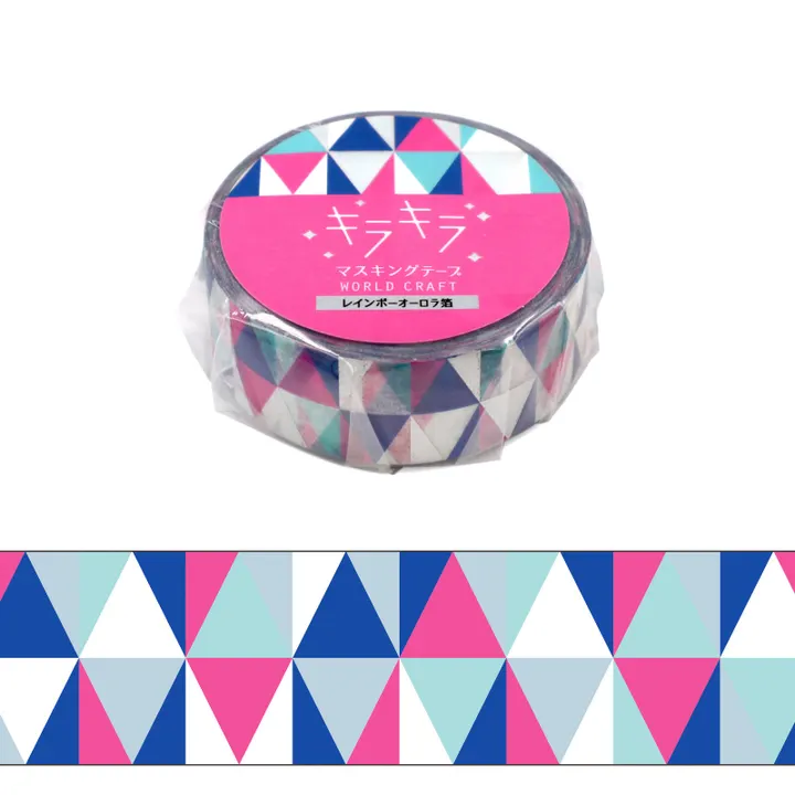 【 キラキラマスキングテープ 15mm Triangle】  ★★ 箔を使用した、キラキラが可愛いキラキラマスキングテープ 〜 第5弾 Lights、Geometric、Flowers の3つをテーマに <12柄> を揃えました ★★ 三角を組み合わせ総柄にした色鮮やかなマスキングテープ。 手帳やレターなどにデコレーションすれば デコレーションしたアイテムもぐっと引き立ちます♪ 『レインボーオーロラ箔』 を使用しています♪