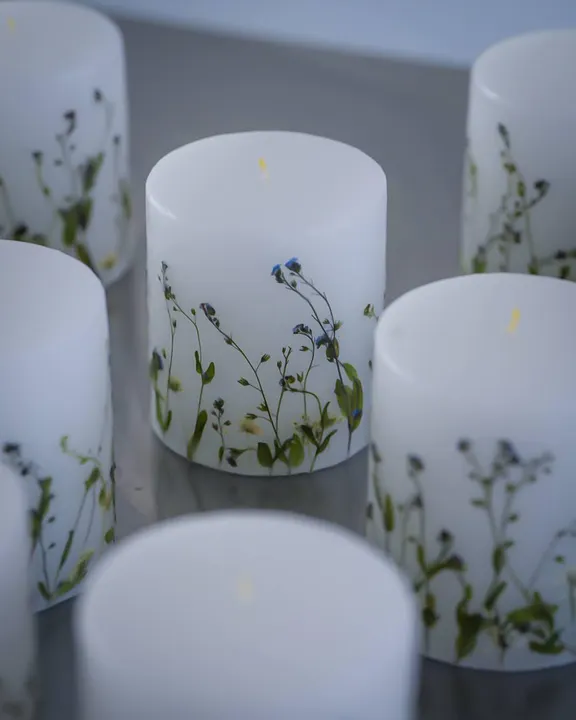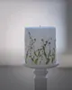 氷の中に花を閉じ込めたような、信州の冬の佇まいを持つ蝋燭です。 透明感のある外層と中央の燃焼部分の構造により、灯すことで表情が変化します。 芯を5〜7mm程度に整えながら灯していただくと、外側の花材部分を残し、中央にゆっくりと火が沈んでいきます。 火が沈むにつれて、花が内側から照らされて浮かび上がり、静かな奥行きを生み出します。 点灯時はもちろん、昼間の自然光の中でも凛とした存在感があります。 花の入り方は一つ一つ異なります。 手仕事ならではの個体差としてご理解ください。