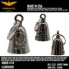 アメリカ製ガーディアンベル社製ガーディアンベルです。 MADE IN USA アメリカ製 交通安全 魔除け 御守り ガーディアンベル アメリカのライダーの間には、事故や、転倒の原因は「道路にひそむ悪魔」によるいたずらだという伝説があります。悪魔は走る者に悪戯やトラブルを運んできます。このベルは美しい音色で悪魔たちを追い払うと言われ愛されています。そんな悪魔のいたずらを防ぎ、御守りとなるのが、守護者のベルという意味を持つガーディアンベル。 日本でも鈴の音(ね)は神道では魔除けの音と言われています。ピューター製の鈴でいい音色でガーディアンベルはデザインも様々あります。 またガーディアンベルにまつわる伝説として、プレゼントとして送られたベルの効果は、自分で手に入れたものの2倍になると言われています。 それゆえに彼氏・彼女・友達・家族へのプレゼントとしての人気も非常に高まっています。 シルバーアクセサリーのようにおしゃれに装着できて素敵な音色を奏でるガーディアンベル。 バイカー以外にも自転車や旅・交通安全のお守りとしてお使いいただけます。 カバン・ランドセル・キーホルダー・ペットの首輪等に付けてお使いください!! ※タイラップ等でバイクのフレームにも簡単に取り付けできます。 アメリカンモデルだけではなく、旧車ファン、レプリカライダーまで、さらにバイクだけでなく、自転車や車にもピッタリな御守りとなっています。 アクセサリーとしても人気で、アイディア次第で車体だけでなく、キーホルダーや鞄など、どこにでも付けておしゃれに楽しめます。
