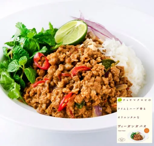 私たちチャヤ マクロビオティックスは、江戸時代から伝わる葉山の老舗料亭「日影茶屋」から誕生しました。国産有機玄米にこだわり、有機・特別栽培の野菜や、豆、海藻を使った料理を提供しています。肉・卵・乳製品・白砂糖・調味料(アミノ酸)を使わずにつくった、体にやさしく、見た目に楽しい料理をお届けします。 弊社レストランのご案内はこちらからご覧ください☟ https://chayam.co.jp/restaurant/ ライムとハーブ香る オリエンタルな ヴィーガンガパオ CHAYAのノウハウで作り上げた本格レシピ ◎調味料(アミノ酸)・香料・着色料不使用 ◎プラントベース ◎本場タイハーブを使用 ◎隠し味にうま藻*を使用 *うま藻とは泡盛粕で育つ、うま味が豊富な"藻"になります。(原材料の乾燥藻パウダーが"うま藻"にあたります。)