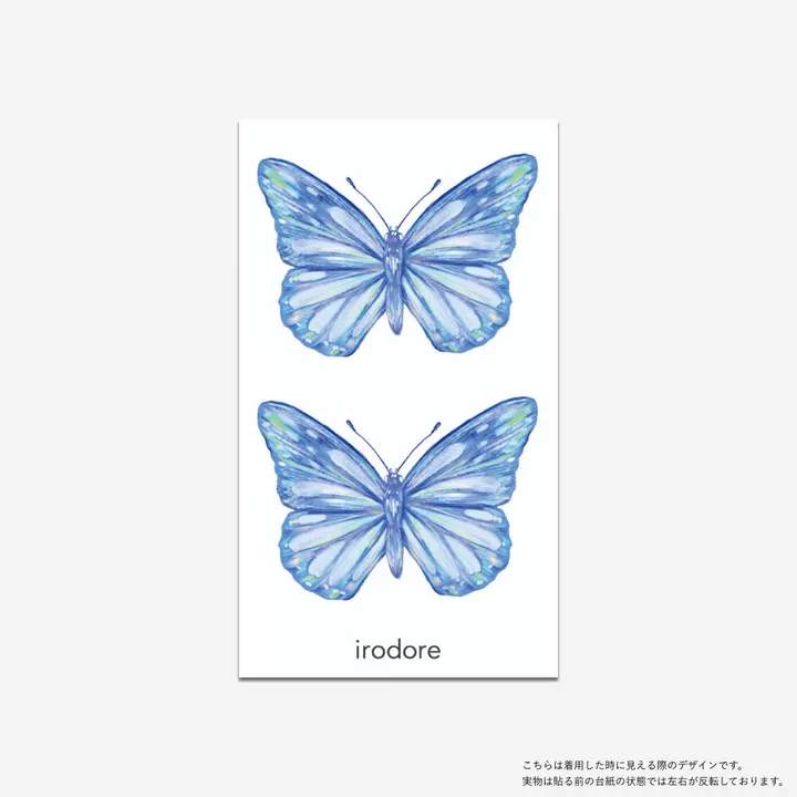 <タトゥーシールについて> ・水で転写するタイプのタトゥーシールです ・約3日間肌に綺麗な状態で保ちます ・裏面に貼り方の説明の記載があります <デザインついて> 韓国で人気なクレヨンタトゥーテイストの蝶々のデザイン。水色がカラータトゥーでも涼しさや爽やかさがありつつ、ポップな印象もあります。 韓国ファッション好き、少し個性的なデザインを求めてる方に特に大変人気です。 <貼り方について> 1. 貼りたいデザインを切り抜きます 2. フィルムを剥がします 3. 貼る場所を決めます(着用するとデザインは反転することに注意) 4. 台紙に水分を染み込ませます 5. 30秒ほど台紙を押さえます 6. ゆっくりを台紙をスライドさせて完成 <ブランドについて> irodoreは「肌に一番近いおまじない」をコンセプトにしたタトゥーシールブランドです。日常的に使えるナチュラルで可愛い、綺麗なデザインを多数展開しています。
