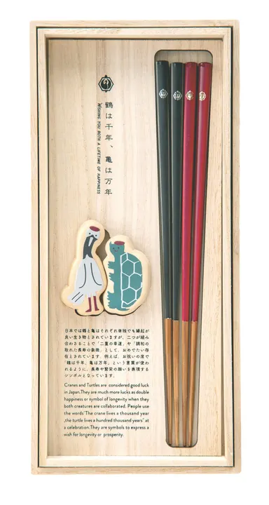 「鶴は千年、亀は万年」は長寿を祝う言葉です。 鶴と亀は、古来から長寿の象徴として大切にされてきました。 ふたつが組み合わさることで「二重の幸運」や「調和の取れた長寿の象徴」として、おめでたい存在とされています。 そんな鶴亀モチーフを使って、寄り添う夫婦になぞらえたセットを作りました。 夫婦箸には鶴と亀の家紋風箔プリントを施し、特別感のある仕上がりとなっています。 天然木の箸置きにはカジュアルな雰囲気の鶴と亀のイラストを。 桐箱入りギフトは海外のお客様からも注目されています。