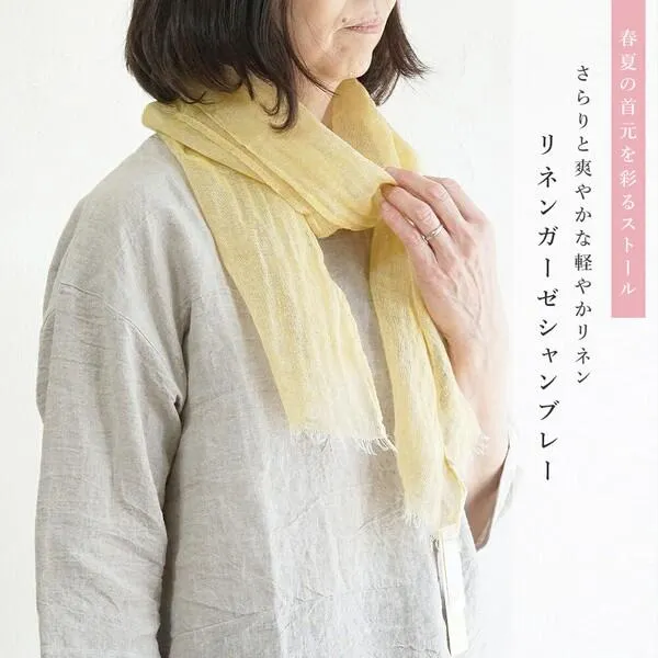 軽やか素材がとカラーが春夏に映えるリネンストール 【リネンガーゼシャンブレー・ミニストール】 透け感のある軽やかなリネンガーゼで出来たストール。 さらりと肌触りよく、軽く着け心地で春夏にぴったり。 さっと巻けるちょうどいい小さ目のサイズ感でどんなコーディネートにも合わせやすいアイテムです。 ふんわり上品にまとまり、明るいカラーバリエーションで顔まわりを明るいイメージに引き立ててくれます。 薄手で軽やかさのあるこちらのストールは、春コーデのワンポイントにはもちろん、夏の紫外線対策にも活躍! 使っていくうちにどんどん柔らかく馴染み、より心地よく。気になる首元のカバーにも活躍してくれるリネンストールです。 薄手のリネンガーゼ。 使っていくうちにハリ感が落ち着きどんどん柔らかくなり、より気持ちのいい使い心地に。 とても軽く爽やかなので、春から夏の紫外線や冷房対策まで活躍してくれます。 お手入れ方法/手洗い こちらの商品はデリケートな素材ですので、着用時やお洗濯の際は過度な負担をお避け下さい。 ◆お取り扱い上のご注意◆ ・この製品の生地はナチュラル感を出すため、糸の節目、ネップ、カスを取り除かずそのまま織っています。また、素材の持ち味を生かして自然な風合いに仕上げるため、加工工程上一部折れスジ等がありますが、それらは加工特性のため不良としてカウントしておりませんので、予めご了承ください。 ・色の濃い製品は着用や洗濯時に表面が毛羽立ち色合いが変化、色落ち移染する場合がありますのでご注意ください。 ・漂白剤のご使用は避けてください。 ・洗濯後の脱水は短めにし、形を整えて速やかに干してください。