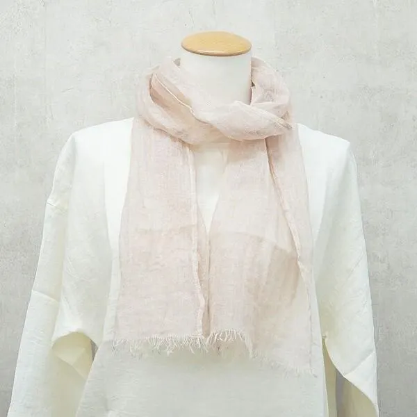 軽やか素材がとカラーが春夏に映えるリネンストール 【リネンガーゼシャンブレー・ミニストール】 透け感のある軽やかなリネンガーゼで出来たストール。 さらりと肌触りよく、軽く着け心地で春夏にぴったり。 さっと巻けるちょうどいい小さ目のサイズ感でどんなコーディネートにも合わせやすいアイテムです。 ふんわり上品にまとまり、明るいカラーバリエーションで顔まわりを明るいイメージに引き立ててくれます。 薄手で軽やかさのあるこちらのストールは、春コーデのワンポイントにはもちろん、夏の紫外線対策にも活躍! 使っていくうちにどんどん柔らかく馴染み、より心地よく。気になる首元のカバーにも活躍してくれるリネンストールです。 薄手のリネンガーゼ。 使っていくうちにハリ感が落ち着きどんどん柔らかくなり、より気持ちのいい使い心地に。 とても軽く爽やかなので、春から夏の紫外線や冷房対策まで活躍してくれます。 お手入れ方法/手洗い こちらの商品はデリケートな素材ですので、着用時やお洗濯の際は過度な負担をお避け下さい。 ◆お取り扱い上のご注意◆ ・この製品の生地はナチュラル感を出すため、糸の節目、ネップ、カスを取り除かずそのまま織っています。また、素材の持ち味を生かして自然な風合いに仕上げるため、加工工程上一部折れスジ等がありますが、それらは加工特性のため不良としてカウントしておりませんので、予めご了承ください。 ・色の濃い製品は着用や洗濯時に表面が毛羽立ち色合いが変化、色落ち移染する場合がありますのでご注意ください。 ・漂白剤のご使用は避けてください。 ・洗濯後の脱水は短めにし、形を整えて速やかに干してください。