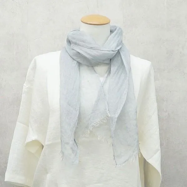 軽やか素材がとカラーが春夏に映えるリネンストール 【リネンガーゼシャンブレー・ミニストール】 透け感のある軽やかなリネンガーゼで出来たストール。 さらりと肌触りよく、軽く着け心地で春夏にぴったり。 さっと巻けるちょうどいい小さ目のサイズ感でどんなコーディネートにも合わせやすいアイテムです。 ふんわり上品にまとまり、明るいカラーバリエーションで顔まわりを明るいイメージに引き立ててくれます。 薄手で軽やかさのあるこちらのストールは、春コーデのワンポイントにはもちろん、夏の紫外線対策にも活躍! 使っていくうちにどんどん柔らかく馴染み、より心地よく。気になる首元のカバーにも活躍してくれるリネンストールです。 薄手のリネンガーゼ。 使っていくうちにハリ感が落ち着きどんどん柔らかくなり、より気持ちのいい使い心地に。 とても軽く爽やかなので、春から夏の紫外線や冷房対策まで活躍してくれます。 お手入れ方法/手洗い こちらの商品はデリケートな素材ですので、着用時やお洗濯の際は過度な負担をお避け下さい。 ◆お取り扱い上のご注意◆ ・この製品の生地はナチュラル感を出すため、糸の節目、ネップ、カスを取り除かずそのまま織っています。また、素材の持ち味を生かして自然な風合いに仕上げるため、加工工程上一部折れスジ等がありますが、それらは加工特性のため不良としてカウントしておりませんので、予めご了承ください。 ・色の濃い製品は着用や洗濯時に表面が毛羽立ち色合いが変化、色落ち移染する場合がありますのでご注意ください。 ・漂白剤のご使用は避けてください。 ・洗濯後の脱水は短めにし、形を整えて速やかに干してください。