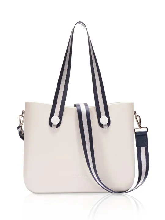 ◆カジュアルとキレイめをいいとこ取りしたバイカラーの2wayトートバッグ。洗練されたホワイトにシックなネイビーが引き立ち、メリハリのあるお洒落へ。普段使いもしやすく、夏場にはマリンアイテムとしても取り入れていただけます。A4サイズが入るトートバッグです。※インナーバッグ付きになります。 ■構成部品 Frame:Eggshell White Nylon Flat Handles:Navy WhiteTwists:Bright White Nylon Strap:Navy White Alma In-Bag:Cream