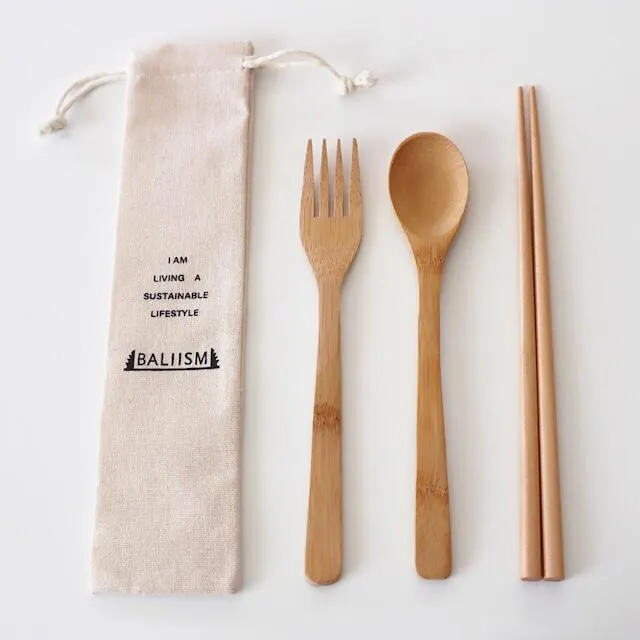 100%天然竹から作られたスプーン、フォーク、箸と収納ポーチのセット。​洗って繰り返し使用できます。 自然な手触りと金属製と比べ軽量であることが特徴です。 持ち運びできる収納ポーチも付いているためご家庭内だけではなく、お弁当利用にも適しています。​ 収納ポーチは丈夫で自然な手触りが心地よいコットン製。​こちらも洗うことができるため衛生的です。 カトラリーは100%天然素材から作られているため、そのまま土に埋めることができます。 土に埋めると自然分解され、植物を育てるための肥料になります。最終的には完全に土に還ります。