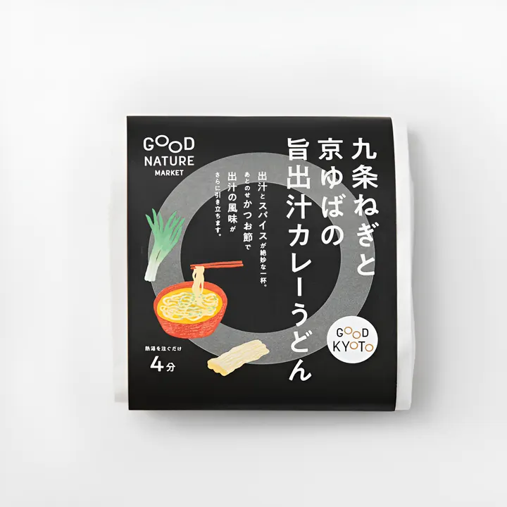お湯を注ぐだけで出来上がる、やさしい味わいのカレーうどんです。北海道産小麦100%のうどんを特殊製法で乾燥。ノンフライの即席麺でありながら、食べ応えのあるコシに仕上げました。出汁とスパイスが絶妙な一杯で、別添えのかつおぶしで出汁の風味がさらに引き立ちます。 〇北海道産小麦100%使用、麺のこだわり。 麺の小麦粉には旨味成分が豊富な北海道産小麦の「きたほなみ」を100%使用。麺は、カレー出汁がよく絡む中細麺を使用しています。ノンフライでありながら、しっかりとしたコシがあり、その魅力はのどごしで、しこしこの食感とつるつるの喉越しが特徴のうどんです。 〇スパイスとかつおが香る、和風の旨出汁スープ。 スパイスとかつおの旨味を活かしたカレースープです。玉ねぎや豚の旨味をベースに、スパイス香るカレースープは、かつお節の旨味を加えることで、親しみやすい風味に仕上げています。適度なとろみがあるため、スープに麺が絡みやすく、別添えのかつお節で、和のおいしさも味わえます。 〇京の熟練した職人が作る、京都「三田久」の湯葉。 三田久では、大正9年以来、良い材料と水、そして京都府優秀技能賞を受賞した熟練の職人技を受け継ぎ、美味しい湯葉を作り続けています。湯葉は豆と水だけで作るため、よい素材を使うことが、おいしい湯葉をつくる秘訣です。三田久の湯葉は京都の清浄な地下水と、最良質の国産大豆を使い、一枚一枚、職人の手作業で、ていねいに作られています。九条ねぎと京湯葉をあわせることにより、京都らしいカレーうどんに仕上げました。 〇風味の良い京野菜、九条ねぎを薬味に使用。 味・品質にこだわった九条ねぎをフリーズドライではなく、低温熱風という製法でじっくりと時間をかけて風味の良さを残しました。葉肉が厚く食べごたえのある九条ねぎだからこそ、乾燥タイプでもスープに入れると水分を含み、ボリューム感があります。 〇お湯を注ぐだけ。軽食やお夜食にも便利。 旨出汁カレーうどんは、お湯を注ぐだけで手軽においしくお召し上がりいただけます。 やさしい味わいで、軽いお食事や汁物の代わり、お夜食にもぴったり。お子さまから年配の方まで、幅広く召し上がっていただけます。 常温保存のため、保存食やギフトとしても喜ばれる商品です。 〇京都のGOODな食材、食の知恵、作り手たち。「GOOD KYOTO」 京都で大切に育まれた、安心・安全な自然食材。古来より京都に根付く、自然を敬う豊かな食の知恵。昔ながらの製法を大切にする、素晴らしいつくり手。美味しいだけじゃない、心にも体にもGOODな京都の食を、リスペクトを込めてお届けします。 〇お召し上がり方 1.麺とスープを器に移し、沸騰させたお湯(または再沸騰させたポットのお湯)を麺が完全に浸るまで注いでください。(約400ml程度) 2.ラップや鍋のふたなどを器に被せてください。 3.4分後、ふたを開け、よく混ぜてください。 4.仕上げに、かやく(ねぎ・ゆば)を入れ、かつお節を添えてお召し上がりください。 ※熱湯を扱いますので、やけどには充分気を付けてください。 ※湯戻りが悪い(麺が固い)時は、レンジで約1分、加熱してください。