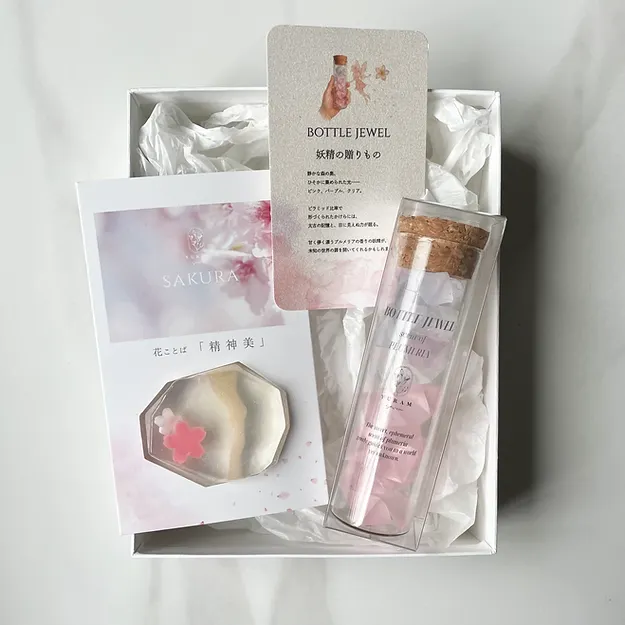 ハンドソープとして、水に濡らしてお使いください。 また、インテリアとして飾ってお楽しみいただけます。 ◎ボトルジュエルはご使用前に、リフィルから出して瓶に詰め替えてからお使いください。 石鹸3~5粒くらいを瓶から出していただき、石鹸ネットを使用するともこもこ泡になります。(石鹸ネットを使用せず、そのままお使いもいただけます) ================ ――ある春の朝、 花びらがそっと舞い降りる空の下、 森の奥で妖精たちは静かに¨光¨を集めていました。 それは優しさと祈りを閉じ込めた、夢のかけら ふたつの物語が重なり合い、ひとつの宝石箱が生まれました。 YURAMが贈る、幻想と癒しに包まれるギフトセット。 透明感に満ちた、あなただけの小さな魔法をお届けします。 GIFT BOX SET 内容 1. 宝石石鹸―さくら— 2. ボトルジュエル―妖精の贈り物― 1. 宝石石鹸―さくら— 桜の花を閉じ込めた、和の美しさが香る石鹸。 香りは「さくら」 天の川を思わせるゴールドラメが輝き、 ふんわり甘い香りが心まで癒します。 花言葉は「精神美」 想いを込めた贈り物にぴったりのひと品です。 ・標準重量:15g ・サイズ:(縦)約3㎝(横)約4㎝ 2. ボトルジュエル―妖精の贈り物― ピンク・パープル・クリアの光のかけらが重なった、 幻想的な宝石石鹸。 香りは「プルメリア」 花言葉は「気品」 ハワイ語では「大切な人の幸せを願う」 想いをそっと届ける、優しさの結晶です。 ストーリーカード付きで、 幻想的な世界観をそのまま楽しめるのも魅力のひとつです。 ・標準重量:25g 花と光の物語を大切な誰かへ。 日常にそっと寄り添う、小さな魔法のギフトです。 ◆YURAMのこだわり —国内産・国内製造― 神奈川県・小田原の自然豊かな工房で、一つ一つ手作業で丁寧に制作しております。そのため、色味や形に多少の個体差が生じる場合がございますが、一点ものの風合いとしてお楽しみください。 国内産の植物由来の原料をベースにしておつくりしております。 また、ボトルジュエルは佐渡沖の海洋深層水を使用した大吟醸の酒粕を配合。天然のアミノ酸やミネラルが、肌にしっとりとした潤いを与えます。 きめ細やかでクリーミーな泡が、心地よく肌を包み込みます。 ◆洗練されたオリジナルギフトボックス 銀箔でYURAMロゴをあしらった、 上質で重厚感のある専用ギフトボックスにお入れしてお届けします。 そのまま贈れる高級感のある仕上がりで、お誕生日・記念日・結婚祝い・お礼の品など、さまざまなギフトシーンにぴったりです。