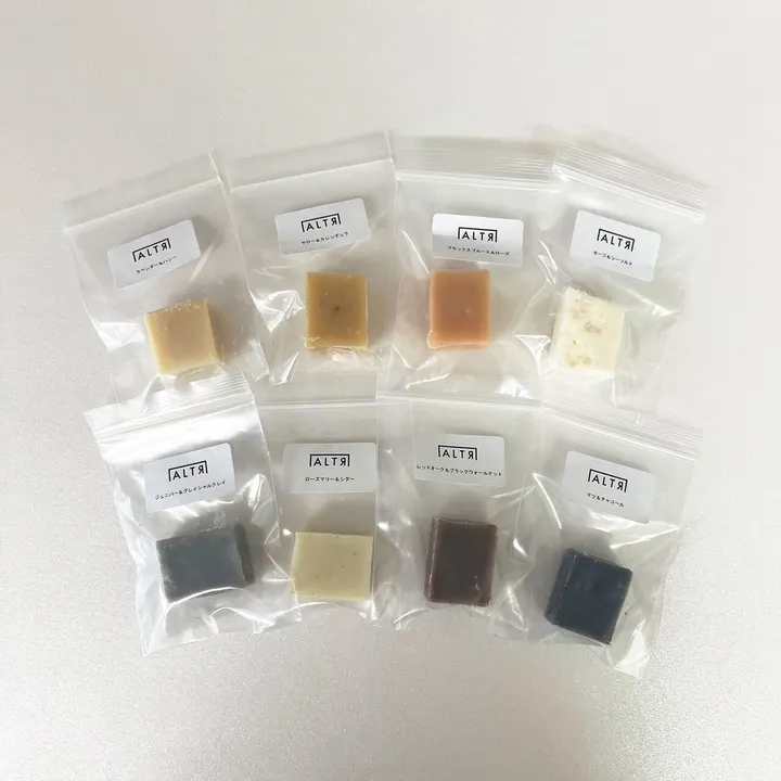 ●フェイスソープ(ラベンダー&ハニー): オルターのハーブガーデンで育てたラベンダーから抽出したラベンダーエキスと、地元の養蜂家が採取したローハニー(非加熱)を加えた石けん。ラベンダーは体と心の神経緊張の影響を軽減し、休 息と回復を促進します。はちみつには驚くべき治癒力があり、時間の経過とともにシミや傷跡を減らします。敏感肌や肌トラブルのあるときに。 ●フェイスソープ(ヤロー&カレンデュラ)[無香料]: オルターのハーブガーデンで育てたヤローに、カレンデュラを加えたソープ。お肌を落ち着かせ、栄養を与えます。カレンデュラは優れた抗炎症作用があり、筋肉のこわばりを緩めます。ヤローには、不安を軽減させる作用もあり、心理的にも生理的にも落ち着くように設計されています。 ●フェイスソープ(ブラックスプルース&ローズ): ブラックスプルースとローズを集めて乾燥させ、爽やかでリラックスできる香りの石けんを作りました。スプルースは効果的な消毒剤で、骨や筋肉の痛みを和らげるのに最適です。ローズは有名な抗炎症剤および鎮痛剤です。この石けんは、爽快感と鎮痛効果をもたらすよう設計されています。 ●フェイスソープ(セージ&シーソルト): 細かく挽いた海塩と野生のセージのエキスを混ぜた、洗浄効果とミネラルが豊富な石けん。セージは心を落ち着かせ、体の平穏を取り戻すのに役立ちます。海塩は肌の油分バランスを整えます。この石けんは、精神的にも生理的にも落ち着くように作られています。 ●フェイスソープ(ジュニパー&グレイシャルクレイ): ワイルドクラフトのジュニパーの果実と枝葉から抽出したエキスと、カナダのブリティッシュコロンビア州の氷河から採取したグレイシャルクレイをあわせた、ミネラル豊富な石けん。血行を促進し肌を活性化させ、むくみを流します。グリーン、レモン、ウッディの香りが爽やかな、朝のシャワーにぴったりの香り。 ●フェイスソープ(ローズマリー&シダー): オルターのでハーブガーデン育てたローズマリーと、地元のシダーをあわせた、爽やかさとウッディーさをあわせた、リラックスできる香りの石けん。ローズマリーには抗炎症作用があり、肌を落ち着かせると同時に、血液循環を穏やかに促進して肌の健康を強化します。シダーとローズマリーには抗菌作用があり、肌を守りながらニキビを抑えます。 ●フェイスソープ(レッドオーク&ブラックウォールナット): 粉砕したブラックウォールナットの殻とレッドオークの 樹 皮 を 組 み 合 わ せ た 、スモ ー キ ーでウッディーな香りの石けん。肌のすみずみまでしっかりと洗浄できます。ブラックウォールナットとレッドオークには、非常に効果的な抗菌作用があり、肌をなめらかで清潔に保ちます。オルターの中で、最も深く洗浄する石けんです。 ●フェイスソープ(マツ&チャコール): 地元で採取した野生の松と、炭を組み合わせた、リフレッシュと浄化の石けん。松は収れん剤として、肌のべたつきを抑え、毛穴を引き締めます。炭は多孔質構造で、自重の数百倍の不純物を吸着すると言われています。オルターのラインナップ中で、最も強力で、最も深く洗浄する石けんです。
