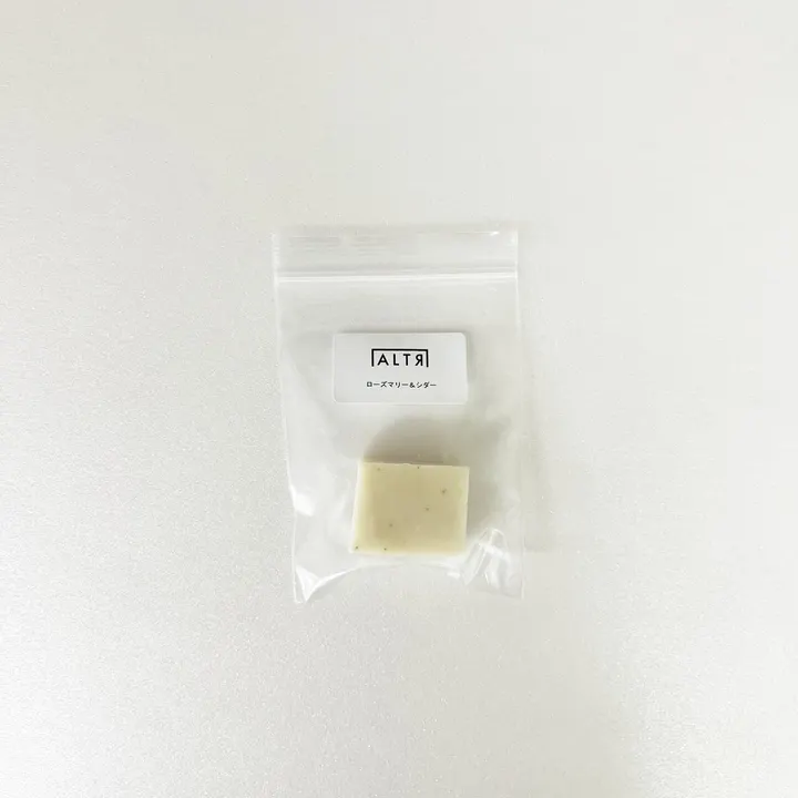 ●フェイスソープ(ラベンダー&ハニー): オルターのハーブガーデンで育てたラベンダーから抽出したラベンダーエキスと、地元の養蜂家が採取したローハニー(非加熱)を加えた石けん。ラベンダーは体と心の神経緊張の影響を軽減し、休 息と回復を促進します。はちみつには驚くべき治癒力があり、時間の経過とともにシミや傷跡を減らします。敏感肌や肌トラブルのあるときに。 ●フェイスソープ(ヤロー&カレンデュラ)[無香料]: オルターのハーブガーデンで育てたヤローに、カレンデュラを加えたソープ。お肌を落ち着かせ、栄養を与えます。カレンデュラは優れた抗炎症作用があり、筋肉のこわばりを緩めます。ヤローには、不安を軽減させる作用もあり、心理的にも生理的にも落ち着くように設計されています。 ●フェイスソープ(ブラックスプルース&ローズ): ブラックスプルースとローズを集めて乾燥させ、爽やかでリラックスできる香りの石けんを作りました。スプルースは効果的な消毒剤で、骨や筋肉の痛みを和らげるのに最適です。ローズは有名な抗炎症剤および鎮痛剤です。この石けんは、爽快感と鎮痛効果をもたらすよう設計されています。 ●フェイスソープ(セージ&シーソルト): 細かく挽いた海塩と野生のセージのエキスを混ぜた、洗浄効果とミネラルが豊富な石けん。セージは心を落ち着かせ、体の平穏を取り戻すのに役立ちます。海塩は肌の油分バランスを整えます。この石けんは、精神的にも生理的にも落ち着くように作られています。 ●フェイスソープ(ジュニパー&グレイシャルクレイ): ワイルドクラフトのジュニパーの果実と枝葉から抽出したエキスと、カナダのブリティッシュコロンビア州の氷河から採取したグレイシャルクレイをあわせた、ミネラル豊富な石けん。血行を促進し肌を活性化させ、むくみを流します。グリーン、レモン、ウッディの香りが爽やかな、朝のシャワーにぴったりの香り。 ●フェイスソープ(ローズマリー&シダー): オルターのでハーブガーデン育てたローズマリーと、地元のシダーをあわせた、爽やかさとウッディーさをあわせた、リラックスできる香りの石けん。ローズマリーには抗炎症作用があり、肌を落ち着かせると同時に、血液循環を穏やかに促進して肌の健康を強化します。シダーとローズマリーには抗菌作用があり、肌を守りながらニキビを抑えます。 ●フェイスソープ(レッドオーク&ブラックウォールナット): 粉砕したブラックウォールナットの殻とレッドオークの 樹 皮 を 組 み 合 わ せ た 、スモ ー キ ーでウッディーな香りの石けん。肌のすみずみまでしっかりと洗浄できます。ブラックウォールナットとレッドオークには、非常に効果的な抗菌作用があり、肌をなめらかで清潔に保ちます。オルターの中で、最も深く洗浄する石けんです。 ●フェイスソープ(マツ&チャコール): 地元で採取した野生の松と、炭を組み合わせた、リフレッシュと浄化の石けん。松は収れん剤として、肌のべたつきを抑え、毛穴を引き締めます。炭は多孔質構造で、自重の数百倍の不純物を吸着すると言われています。オルターのラインナップ中で、最も強力で、最も深く洗浄する石けんです。